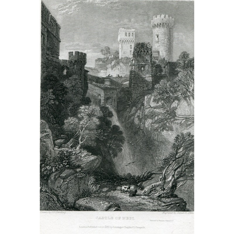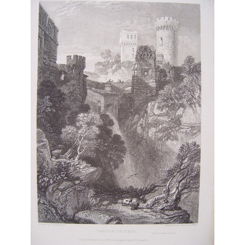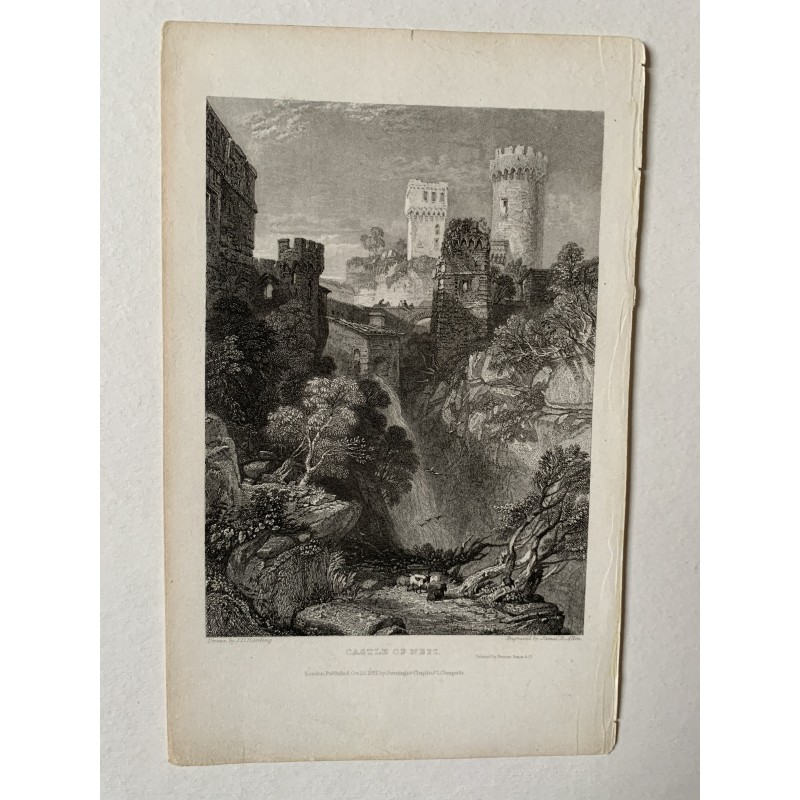Título: Castillo de Nepi. Artista: a partir de obra de James Duffield Harding (1708-1863). Grabador: James Bayle Allen (1803-1876). Fecha de producción: 1832. Tamaño de la imagen: 14 x10,2 cms. Estado: signos de aspereza a lo largo del margen derecho debido a que se quitó de la encuadernación. Un pequeño desgarro en margen superior que no afecta a la imagen.Recipiente :