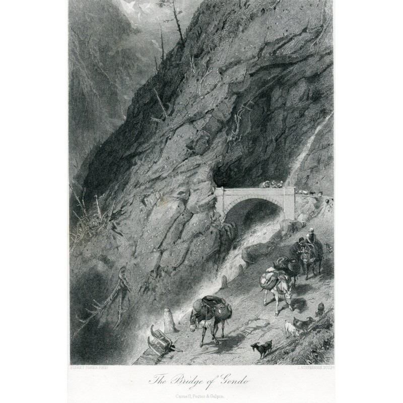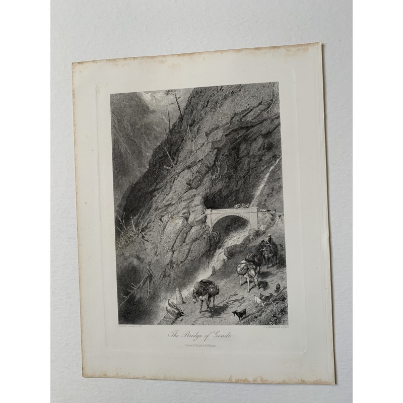 Título: El Puente de Gondo. Artista: Myles Birket Foster (1825-1899). Grabador: James Stephenson (1808-1886). plancha marca: 26,5,5 x19,2 cm. Fecha de producción: c1835-c1872. Estado: bien.Recipiente :