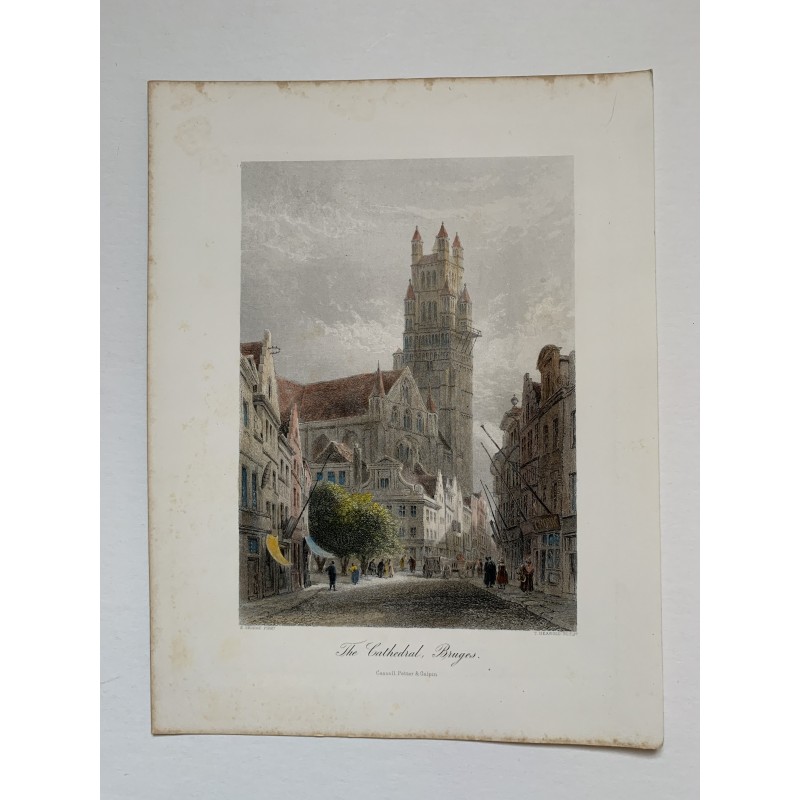 Grabado coloreado a mano de la Catedral de San Salvador en Brujas (Bélgica). Artista: Ernest George (1839-1922) Grabador: Thomas HEAWOOD, (c.1810-c.1870) Tamaño de la plancha: 26,3x19,6 cms En buen estado. Algún manchas que se aprecia en la imagen.Recipiente :