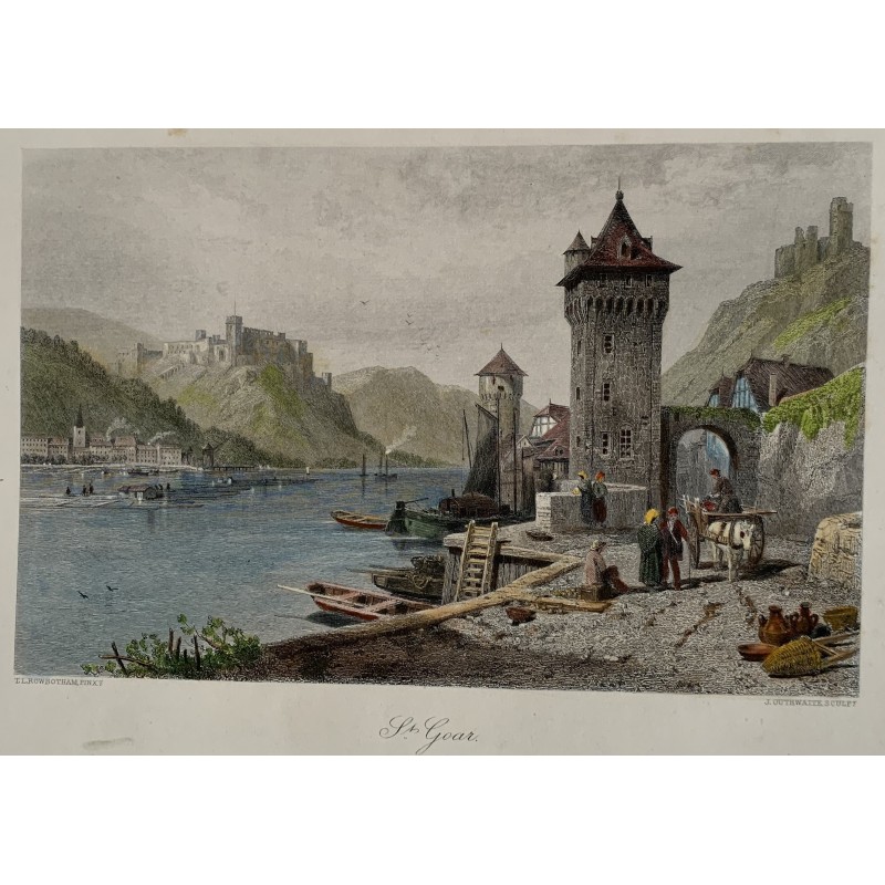 Grabado coloreado a mano de St. Goar (Alemania). Artista: Thomas Leeson Rowbotham.(1783-1853) Grabador: Jean Jacques Outhwaite Tamaño de la plancha: 13,8x21,8 cms. En buena condición. Algún manchas como se puede apreciar en la imagen.Recipiente :