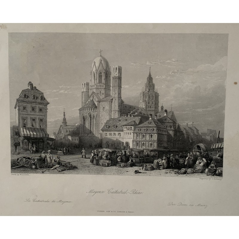 Grabado de la Catedral de Mayence, Rin (Alemania). Artista: William Leighton Leitch (1804-1883). Grabador: James Redaway (1797-1858) Tamaño de la plancha: 12,7x18 cms. En buena condición. Algo de manchas.Recipiente :