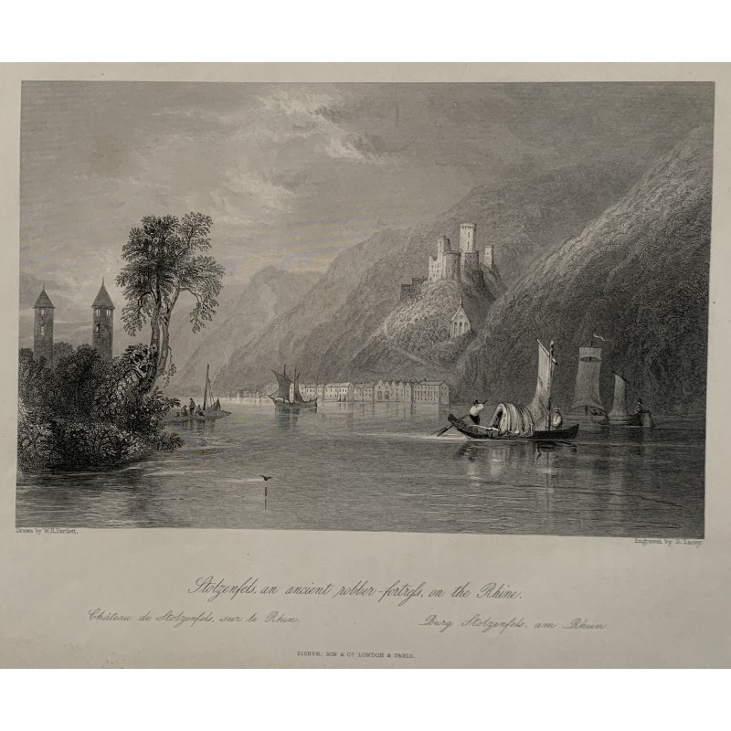 Grabado de Stolzenfels, un antiguo ladrón-fortrefs, en el Rin (Alemania) Artista: a partir de obra de William Henry Bartlett (1809-1854). Grabador: Samuel Lacey (1787 - 1859) Tamaño de la plancha: 12,3x18,8 cms. En buena condición.Recipiente :