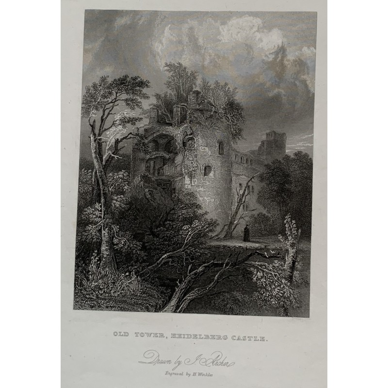 Grabado de Torre Vieja, Castillo de Heidelberg (Alemania) Artista: según James Archer (Americano, activo 183560) Grabador: Henry Wingles (activo en Londres 1819-32) Tamaño de la plancha: 14,7 x11,3 cms. En buena condición. Algún manchas que se aprecia en la imagen.Recipiente :