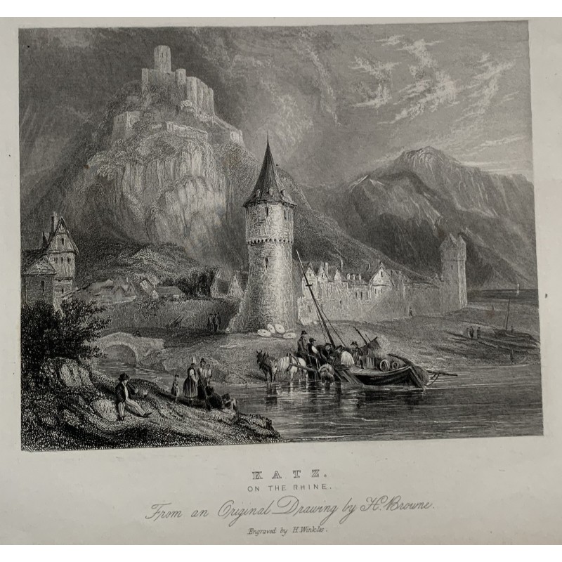 Grabado de Katz en el Rin (Alemania). Artista: según H. Browne Grabador: Henry Winkles (18011860) Tamaño de la plancha: 11,9 x14,7 cms. En buena condición.Recipiente :