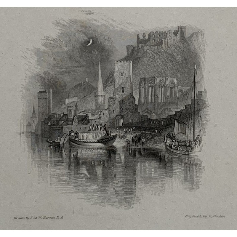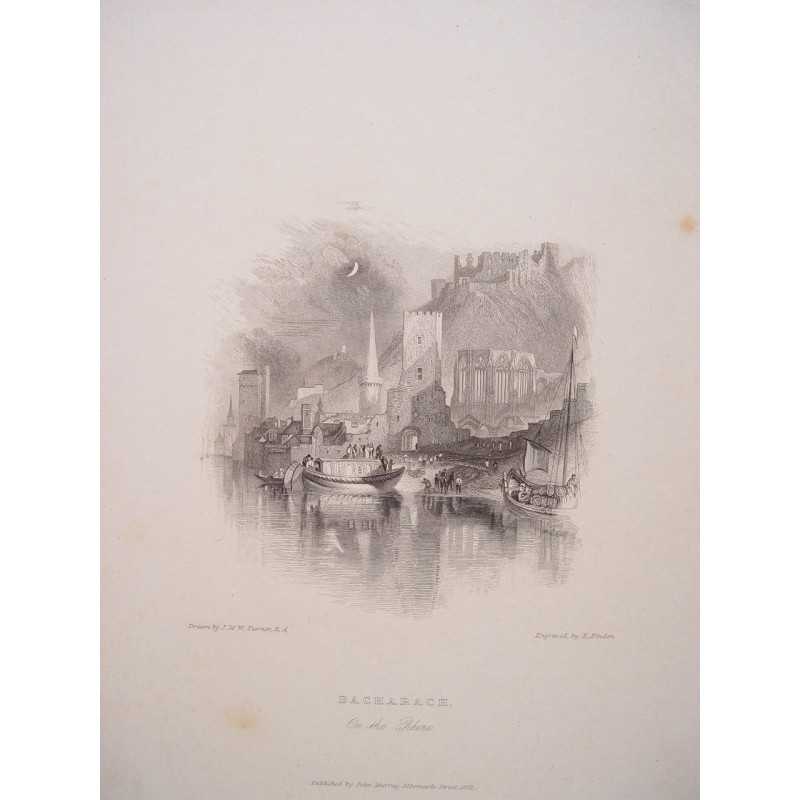 Bacharach, en el Rin. Publicado en 1833. Artista: a partir de obra de Joseph Mallord William Turner (7751? - 1851) Grabador: Edward Francis Finden (1791-1857) Editor: John Murray Tamaño de la plancha: 23,1 x17,8 cms En buen estado. Algo de manchas. Escanee cuidadosamente.Recipiente :