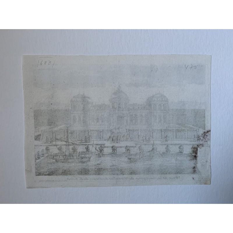 Vista y perspectiva de la entrada del castillo de Saint Cloud ('Veüe et perspectiva de l´entrée du Chateau de St. Cloud). Delineavit y grabador: Pierre Aveline, el Viejo. plancha marca: 17,6x25,6 cms. Estado: Está montado sobre papel en una fecha temprana. Tiene alguna restauración en la esquina inferior izquierda que se puede ver en la foto. Afecta ligeramente a la imagen.Recipiente :