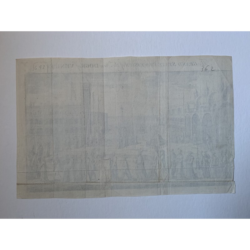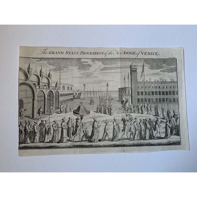 Título: La Gran Procesión de Estado del Nuevo Dux de Venecia. Tamaño de la imagen con inscripción: 20,6x33 cm. Publicado en la revista Gentleman´s Magazine. Fecha de producción: probablemente del siglo XVIII. Estado: este es un grabado de dos pliegues. Hay un desgarro en el margen inferior que se puede ver en la imagen. Escanee cuidadosamente.Recipiente :