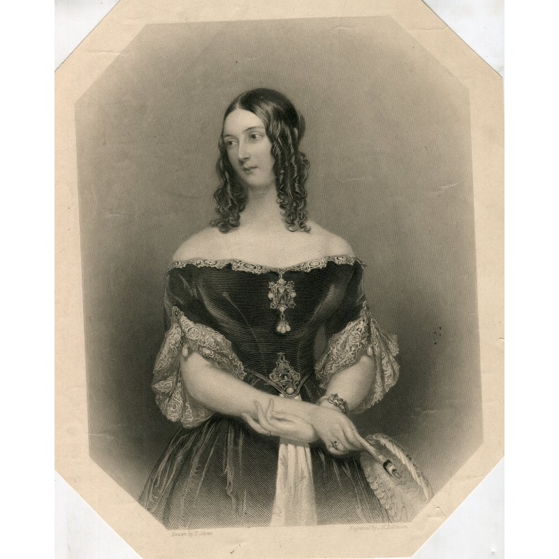 Título: Helen Selina, Lady Dufferin. Esposa del cuarto barón Dufferin; después Condesa de Gifford Artista: a partir de obra de Frank Stone (1800-1859) Grabador: J H Robinson (1796 - 1871) Representado: Helen Selina Sheridan (Sheridan, 1807 - 1867) Fecha: Desconocido. Técnica y soporte: Grabado punteado y de línea sobre papel. Estado: los márgenes están recortados. Tamaño de la imagen: 23,2x18 cms.Recipiente :