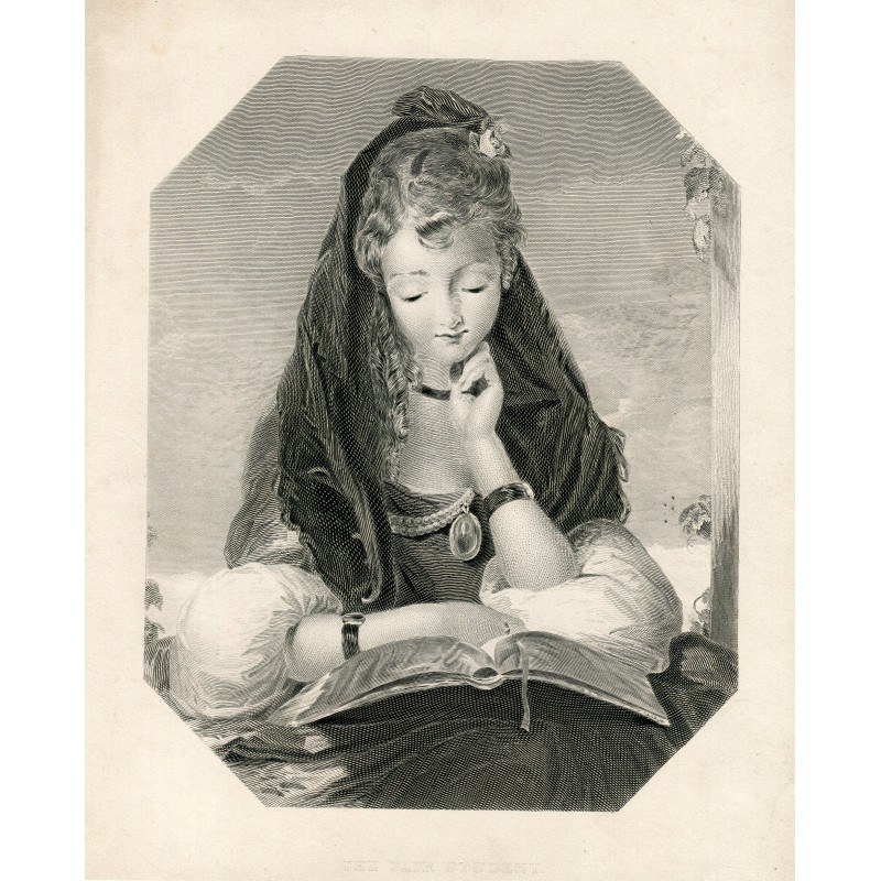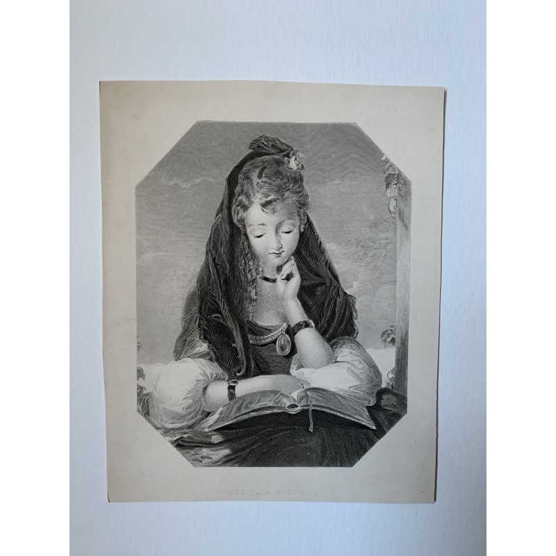 Título: The Fair Student Print realizado por: Samuel Sangster (1805-1872) Después: Gilbert Stuart Newton (1794-1835) Descripción: Una niña sentada tres cuartos de largo hacia adelante en un marco ovalado, leyendo un libro en su regazo, su cabeza apoyada en su mano izquierda, con mantilla y flor en el pelo, nubes al fondo. Tamaño de la imagen: 52,5x47,5 cm. Estado: los márgenes están recortados.Recipiente :