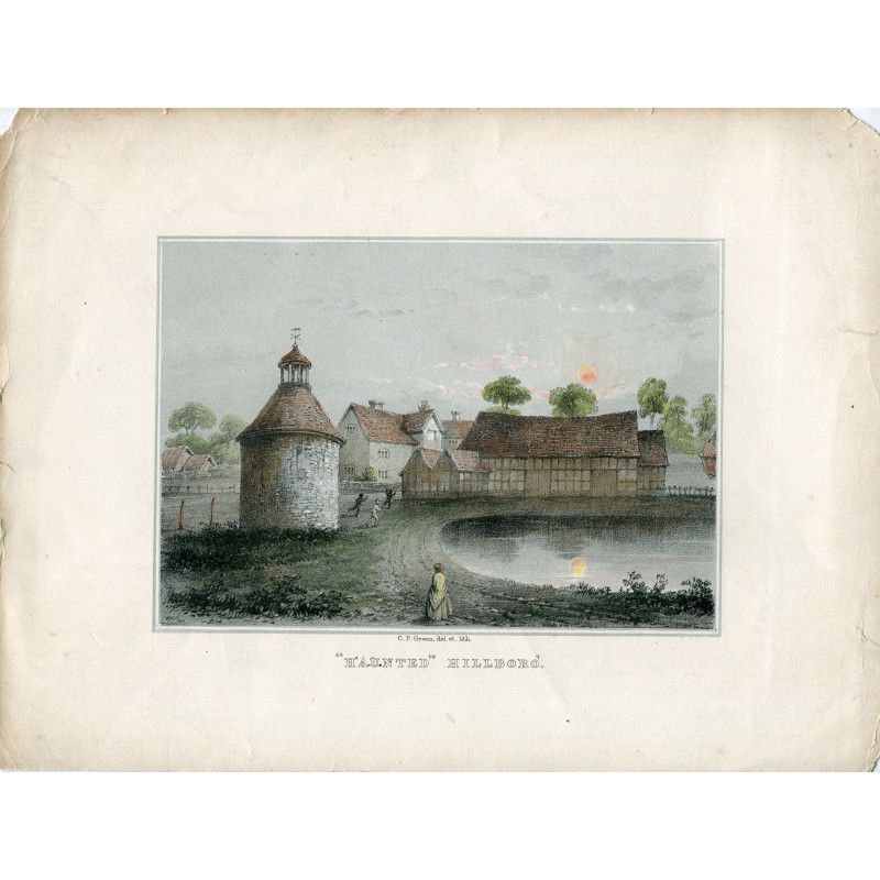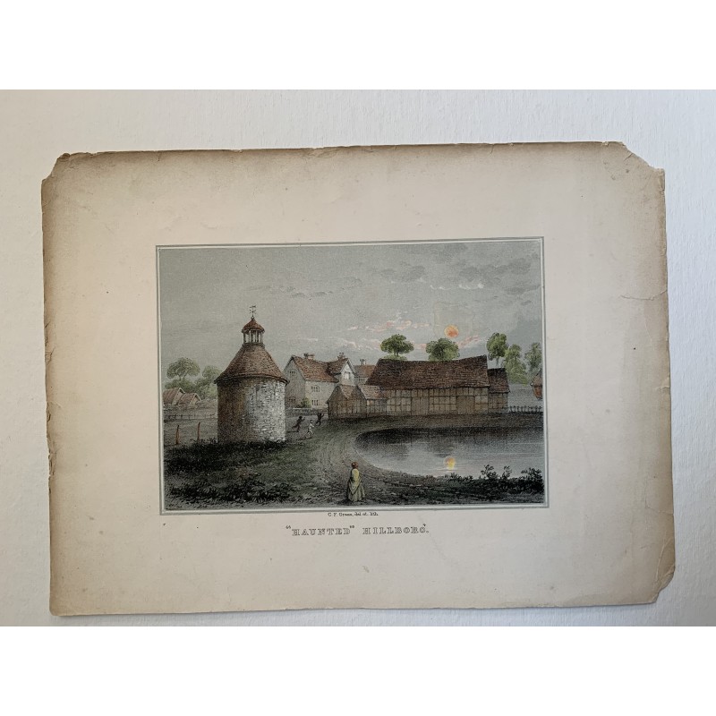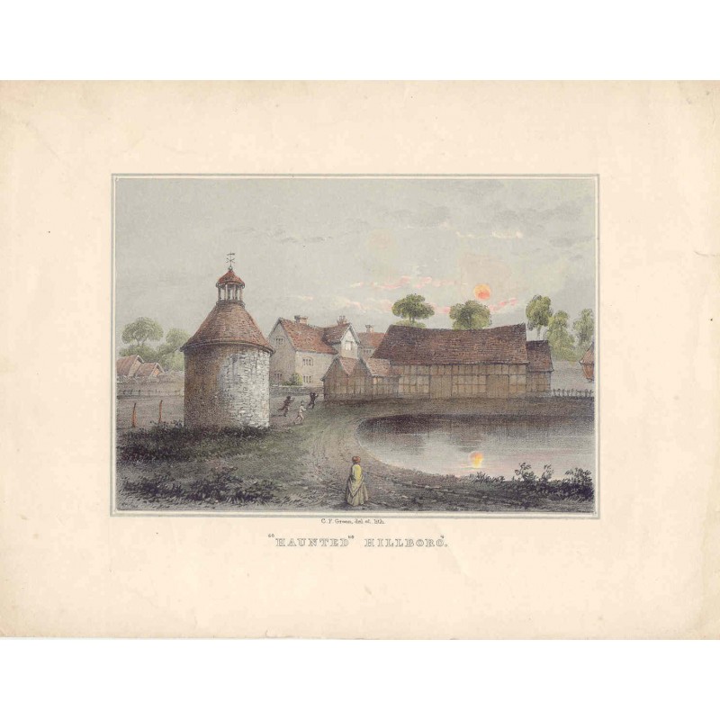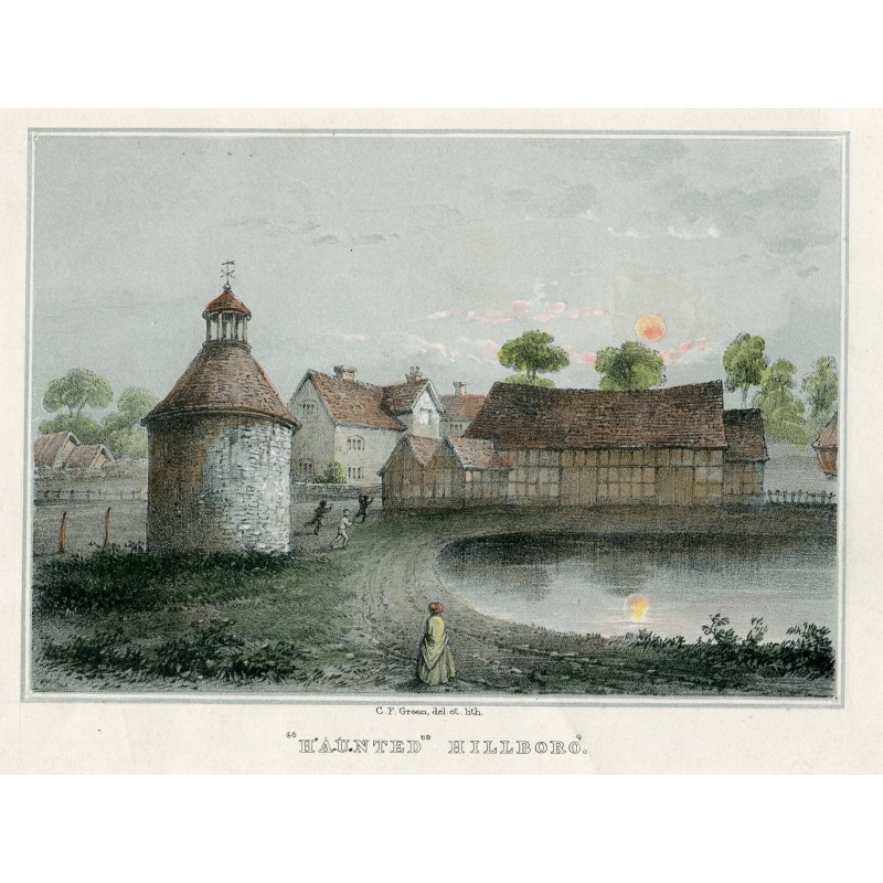 Título: Hillboro Embrujado. Artista y litógrafo: CF Green. Tamaño de la imagen: 12x17,1 cms. Condición: Hay algunas imperfecciones y rasgaduras principalmente en los márgenes y esquinas debido al manejo.Recipiente :