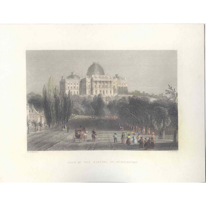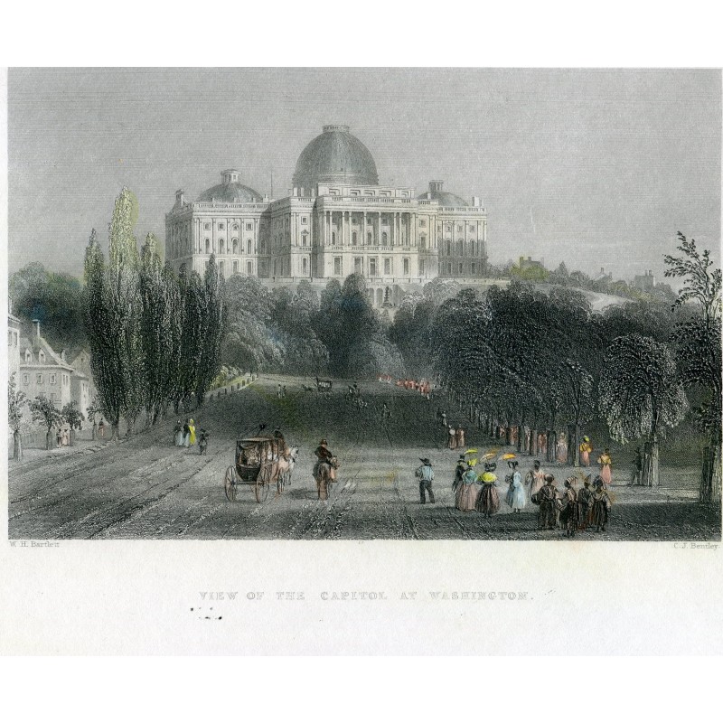 Título: Vista del capitolio en Washington. Grabador: Charles Bentley (1805/64 de septiembre de 1854). Artista: a partir de obra de William Henry Bartlett (1809 - 1854). Descripción: grabado en acero antiguo coloreado a mano en papel avitelado. Fecha de producción: c.1840. Tamaño de la imagen: 11,8x18 cms. Condición: bienRecipiente :