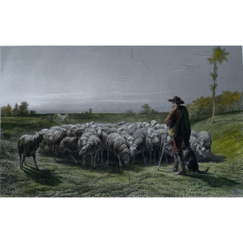 El pastor. Publicado en 1877. Artista: a partir de obra de Rosa Bonheur (1822-1899) Grabador: Charles Cousen (1819-1889) Inscripción: De la imagen de la colección de Henry Wallis, esq. Brixton. Surrey. Tamaño del plato: 16x25 cms. En buena condición.Recipiente :