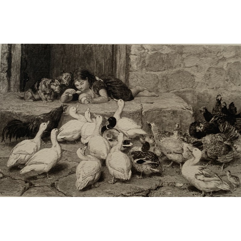 La última cucharada. Publicado en The Art Journal. Artista: según Briton Riviere Grabador: Charles Oliver Murray (Escocés, 1842-1923) Edición: James Sprent Virtue Medidas de la plancha: 15,8x25 cms. En buena condición.Recipiente :