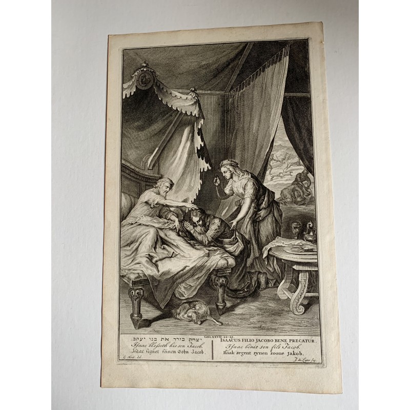 Título: Isaac bendice a su hijo Jacob. Artista: a partir de obra de Gerard Hoet (holandés, 22 de agosto de 1648 - 2 de diciembre de 1733) Grabador: J de Later. Fecha de producción: c.1720. Tamaño de la imagen: 35x21 cms. Condición: tonificación general relacionada con la edadRecipiente :