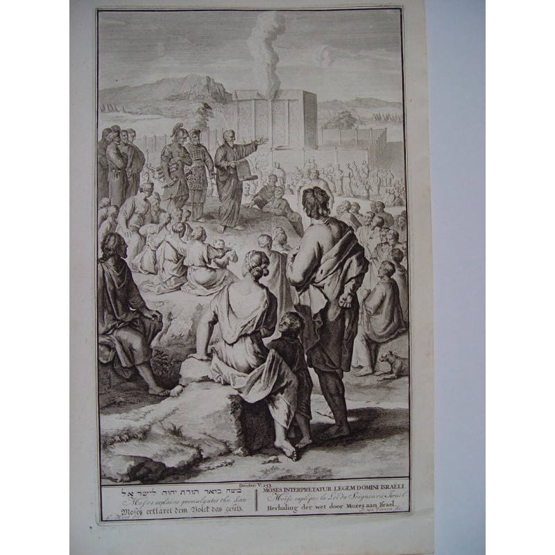 Moses explains promulgates the law. Grabado bíblico original por Gerard Hoet (1648-1733), grabado por J. van Vianen.