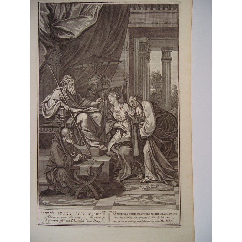 Aashuerus gives his ring to Mordecai. Grabado bíblico original por Picart grabado por Pool