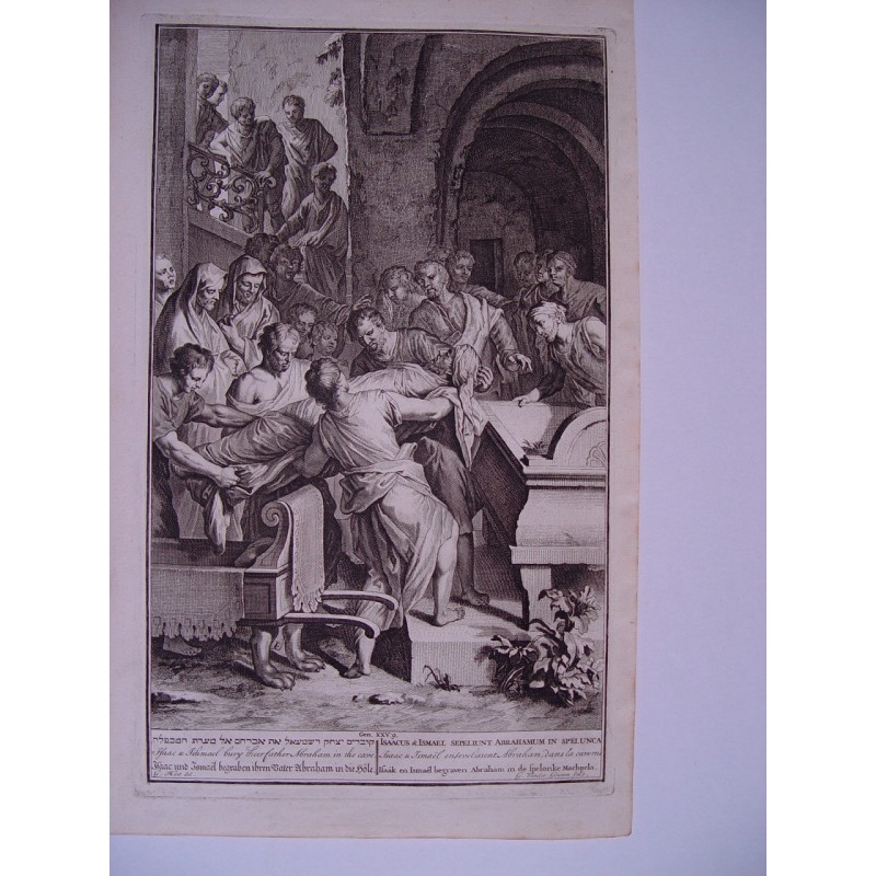 Isaac & Ismael bury their father Abraham in the cave. por Gerard Hoet (1648-1733) grabado por G. vander Gouwen