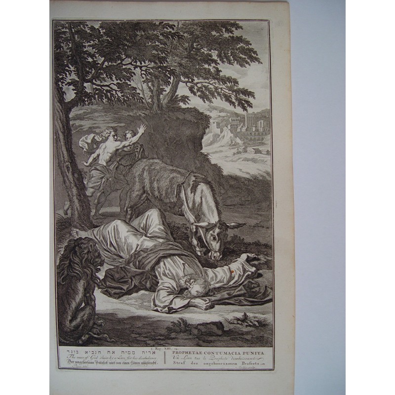 The man of God slain by a lion for his disobedience. Grabado bíblico original por Gerard Hoet (1648-1733), grabado por J. Mulder