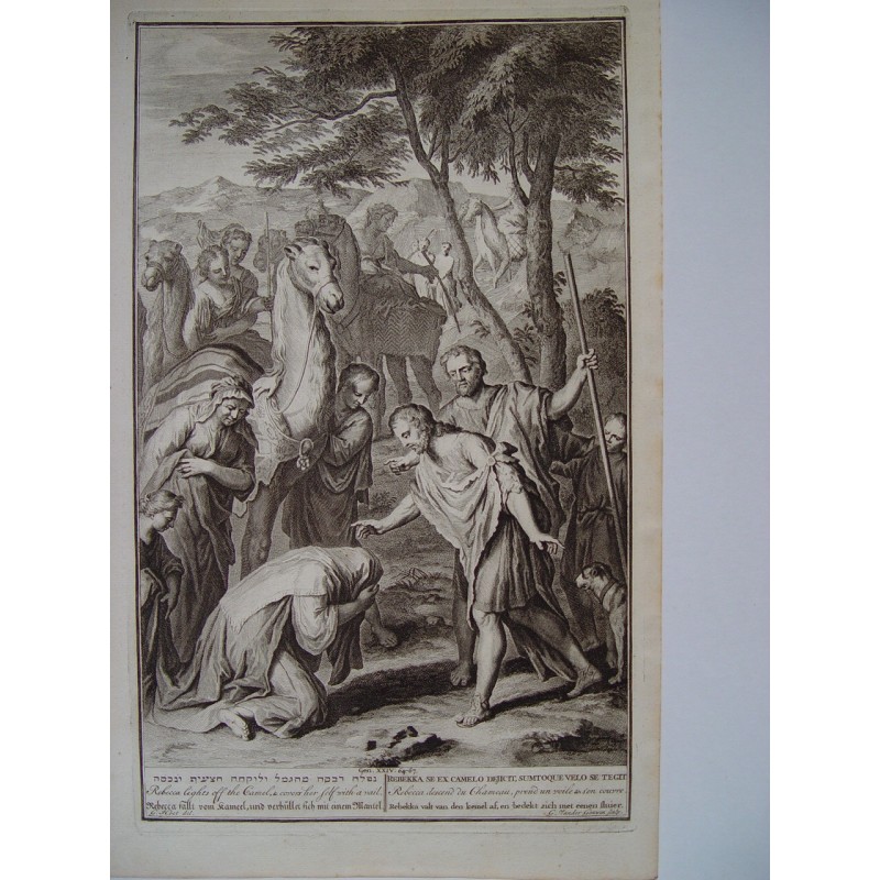 Rebecca lighes off the camel & cobres her self with a vail. Grabado bíblico original por Gerard Hoet (1648-1733).