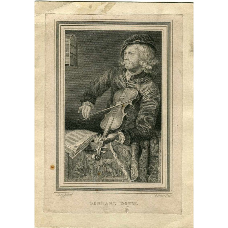 Grabado de Gerard Dou por Courier. Medidas 16,5x11,5 cms. Tiene una manchita de oxido a la izquierda. Pegado a papel.Recipiente :