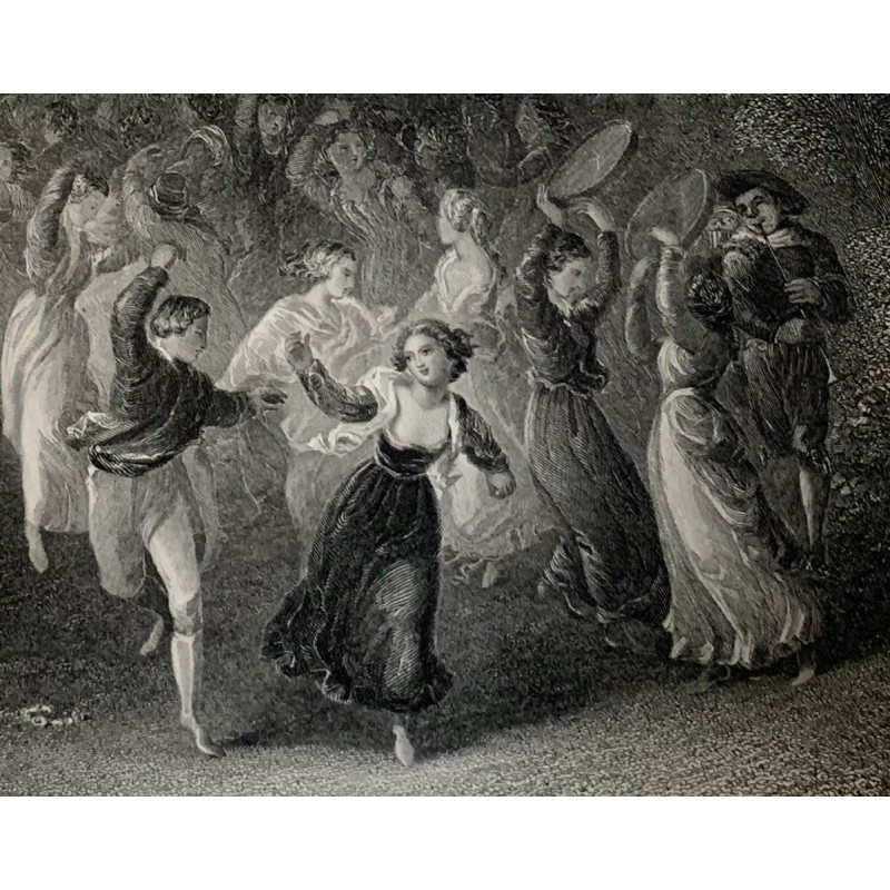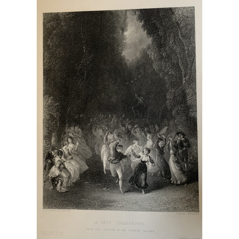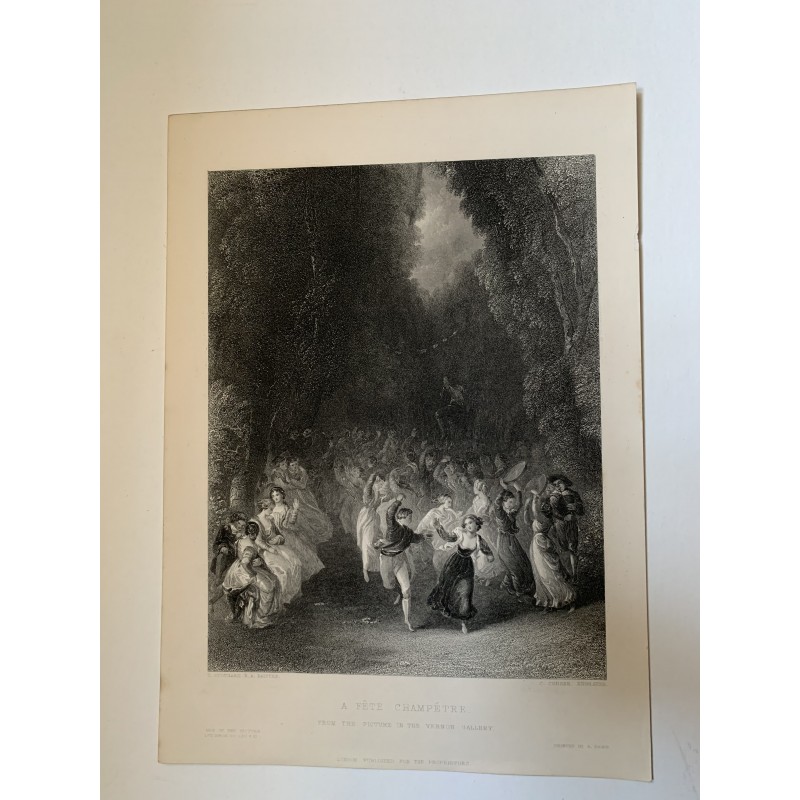 Título: A fête champêtre Grabador: Charles Cousen (1819-1889) Artista: a partir de obra de Thomas Stothard, (1755-1834) Fecha: c1870 Procedencia: The Art Journal Tamaño de la imagen: 24,7x19 cm. Estado: en buen estado.Recipiente :