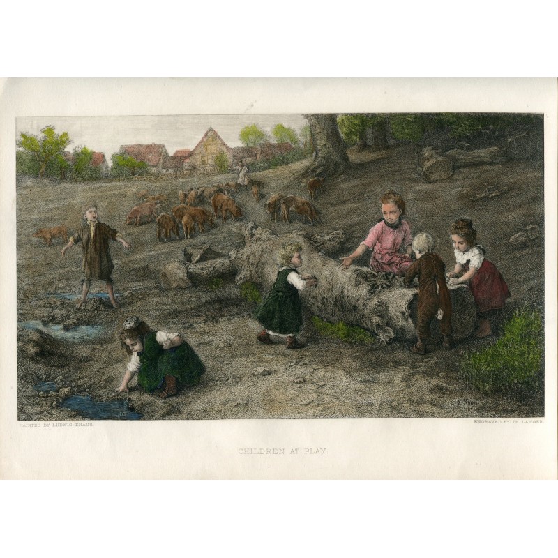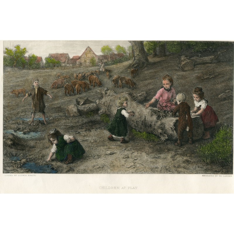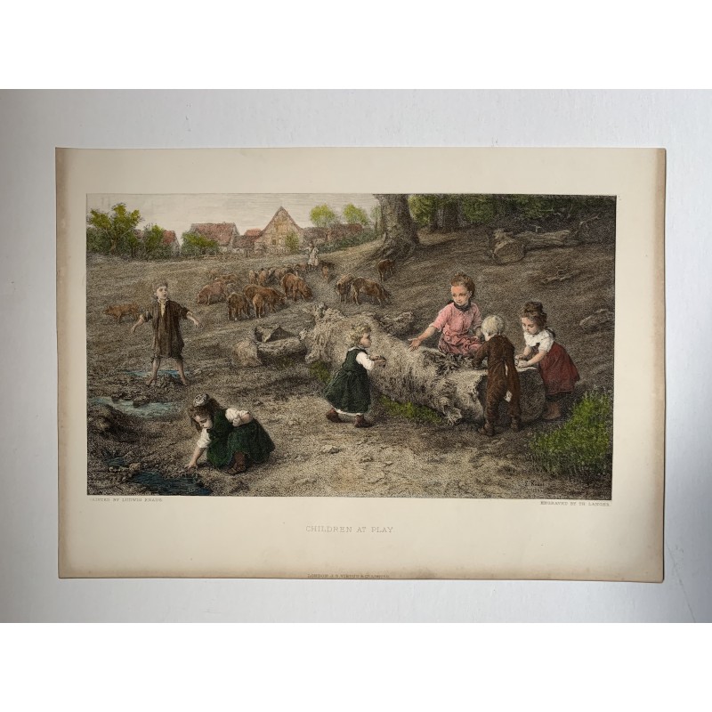 Título: Niños jugando. Artista: a partir de obra de Ludwig Knaus (1829 - 1910). Grabador: Theodor Langer (1819-1895). Descripción: Grabado coloreado a mano. Publicado en The Art Journal. Fecha de producción: 1883. Medidas: 16,2x28 cm. Estado: buen estado.Recipiente :