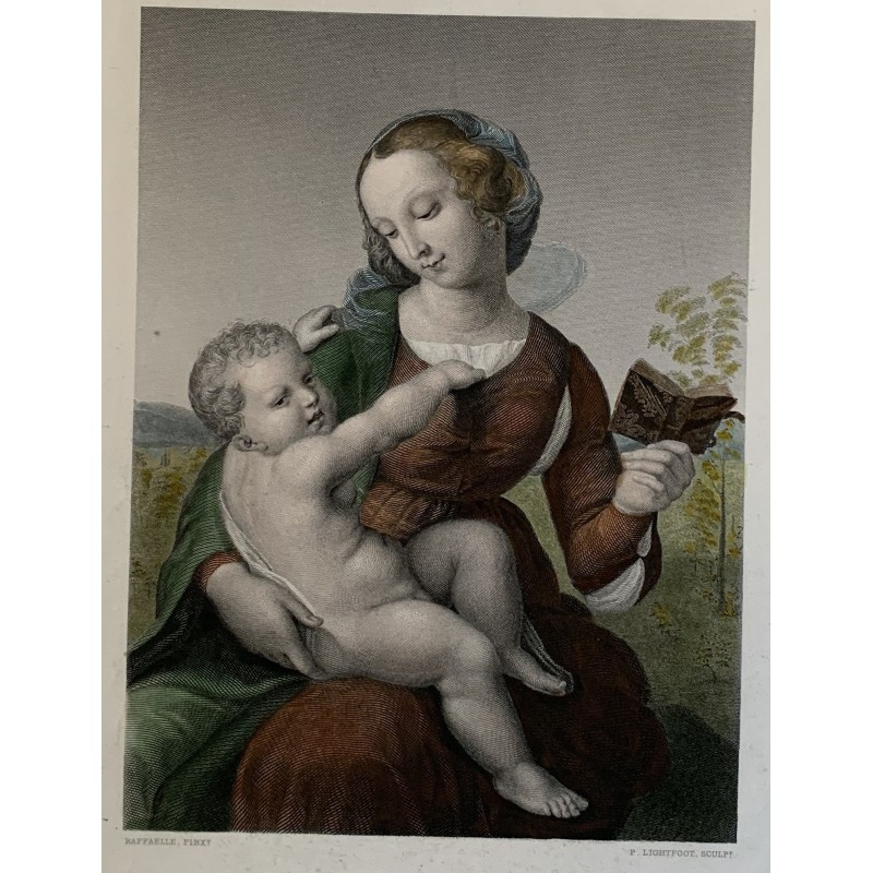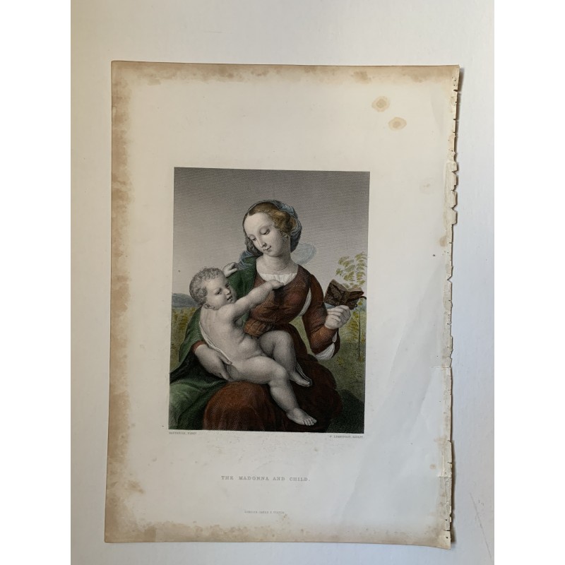 Título: La Virgen y el Niño Grabador: Peter Lightfoot (1805-85) Artista: a partir de obra original de Raphael (Urbino 1483-Roma 1520) Fecha: c 1850 Medio y técnica: Aguafuerte y grabado. Tamaño: 20,4x15,1 cm. Condición: signos de aspereza a lo largo de un borde por haberlo quitado de la encuadernación. Algo de manchas que no afecta a la imagen. Escanee cuidadosamente.Recipiente :