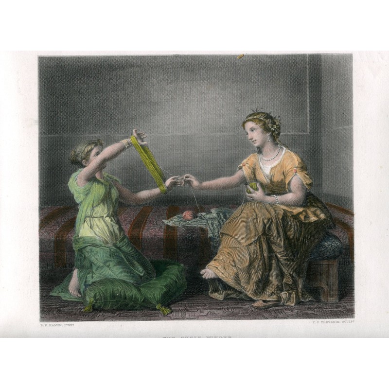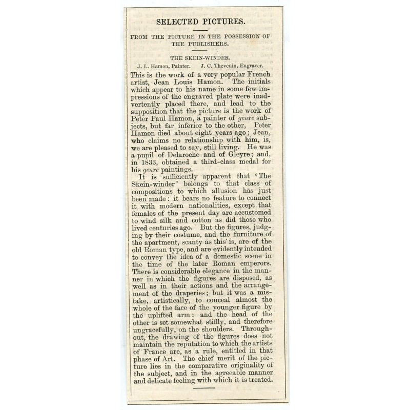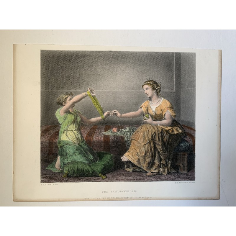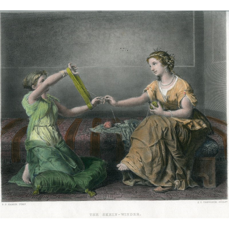 Título: El devanador de madejas. Artista: a partir de obra de Jean-Louis Hamon (1821 - 1874). Grabador: Jean-Charles Beinvenu Gaspard Thévenin (1819-1869). Fecha de producción: 1868. Tamaño de la imagen: 19,8x23,5 cm. Estado: Bien. Margen superior recortado. Por lo demás buen estado.Recipiente :