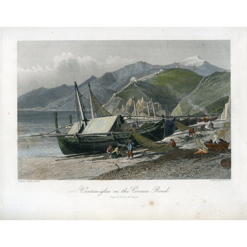 Italia. Ventimiglia on the Cornice Road. grabado por A. Krausse sobre obra de Harry Fenn.