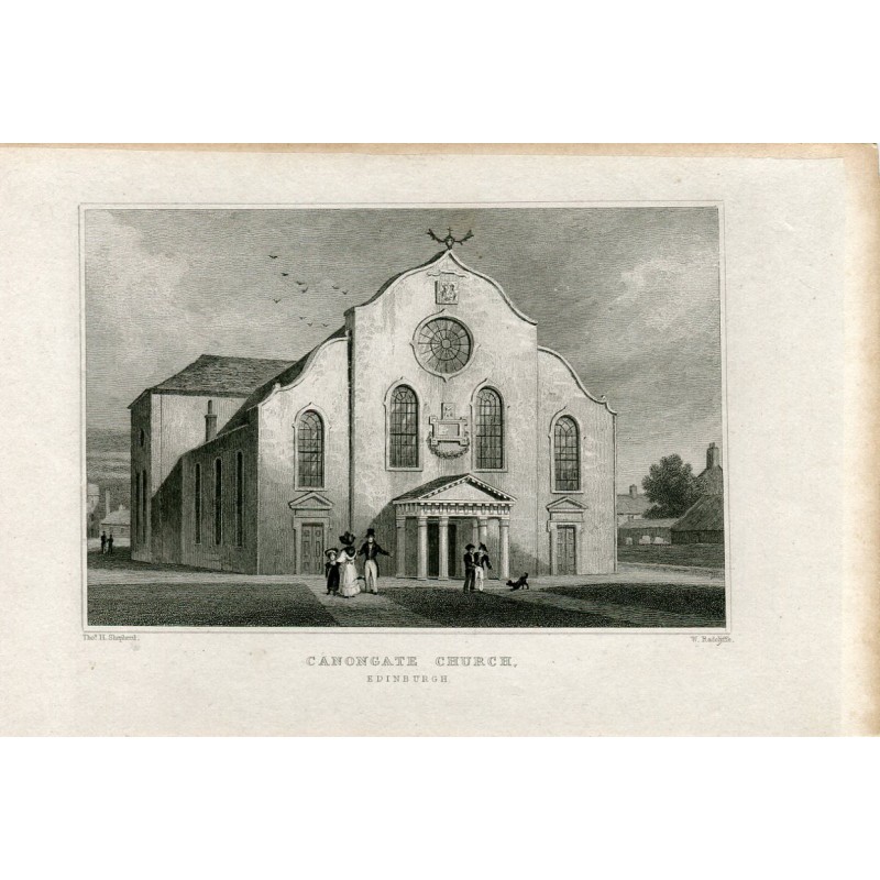 Grabado Canongate Church, Edimburgo grabado por W. Radcliffe en 1833. Dibujó Thomas H. Shepherd. Medidas imagen: 9,5x14,5 cms.Recipiente :