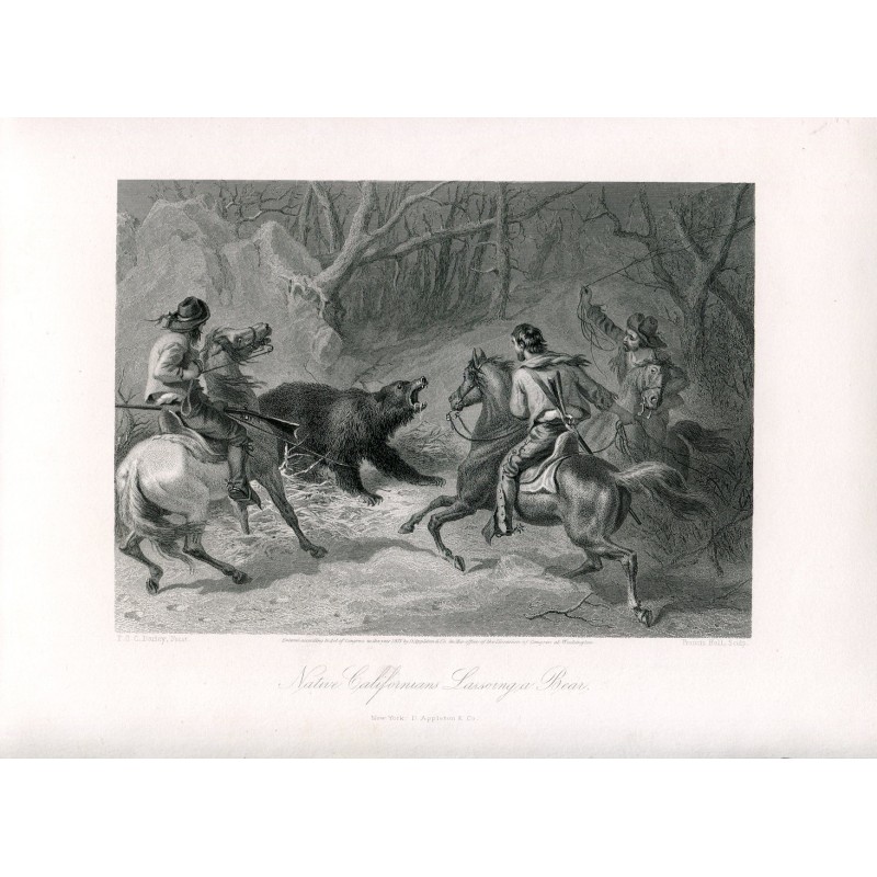 Grabado Native Californian Lassoing Bear en 1873 por Francis Holl sobre obra de F.O.C.Darley. Editado en New York. Medidas imagen: 15x21,4 cms.Recipiente :