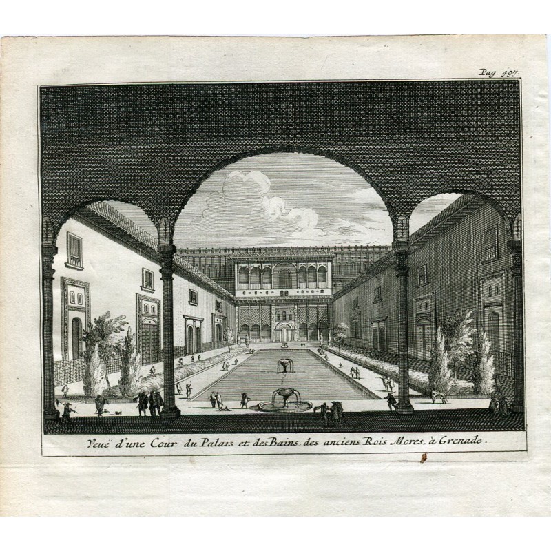Grabado del Palacio y baños de los antiguos Reyes Moros. Procede de la obra de Pieter van der Aa , Delices de Espagne et Portugal, publicada en Leyden (Holanda) 1707 (primera edición) es la obra mas ilustrada sobre España publicada a principios del siglo XVIII. Medidas imagen 12,5x16 cms. Medidas hoja:16,4x18,4 cms.Recipiente :