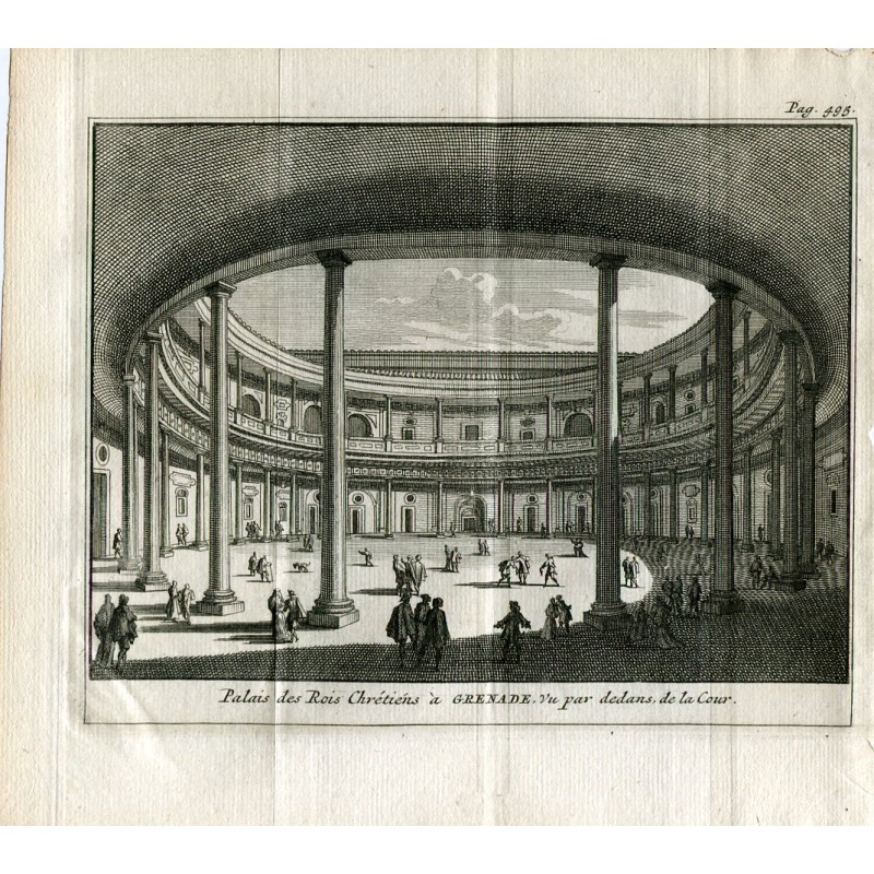 Grabado del Patio del Palacio de los Reyes Cretienses. Procede de la obra de Pieter van der Aa , Delices de Espagne et Portugal, publicada en Leyden (Holanda) 1707 (primera edición) es la obra mas ilustrada sobre España publicada a principios del siglo XVIII. Medidas imagen 12,5x16 cms. Medidas hoja:16,4x18,2 cms.Recipiente :