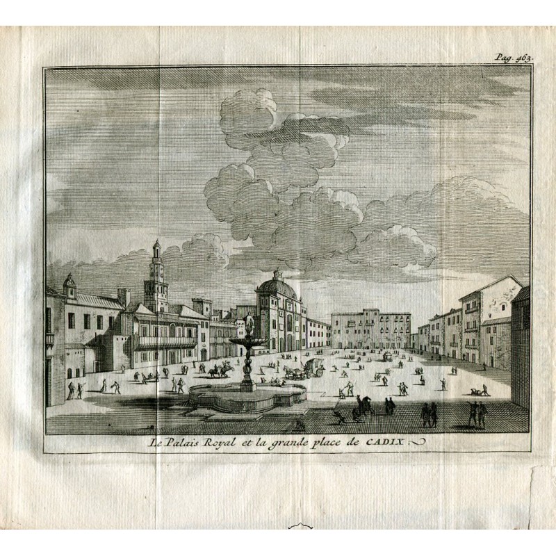 Grabado Le Palais Royal et le grannde place de Cadiz. Procede de la obra de Pieter van der Aa Delices de Espagne et Portugal, publicada en Leyden (Holanda) 1707 (primera edición) es la obra mas ilustrada sobre España publicada a principios del siglo XVIII. Medidas imagen 12,4x16 cms. Medidas hoja:16,4x19 cms. .Recipiente :