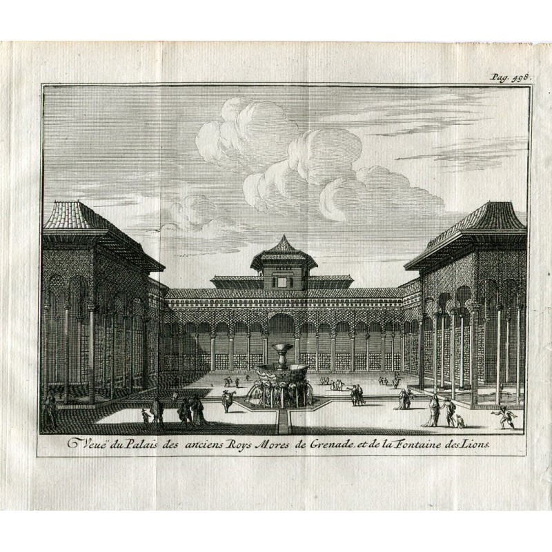 Grabado Veue du Palais des anciens Roys Mores de Grenade et de la Fontaine de Lions. Procede de la obra de Pieter van der Aa Delices de Espagne et Portugal, publicada en Leyden (Holanda) 1707 (primera edición) es la obra mas ilustrada sobre España publicada a principios del siglo XVIII. Medidas imagen 12x16 cms. Medidas hoja:15,4x19,3 cms.Recipiente :