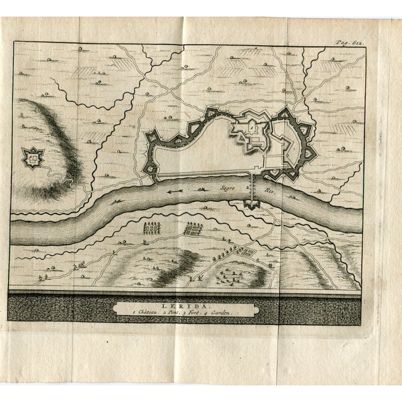 Grabado. Plano de Lérida. Procede de la obra de Pieter van der Aa Delices de Espagne et Portugal, publicada en Leyden (Holanda) 1707 (primera edición) es la obra mas ilustrada sobre España publicada a principios del siglo XVIII. Medidas imagen 12,5x16 cms. Medidas hoja:16,4x18,2 cmsRecipiente :