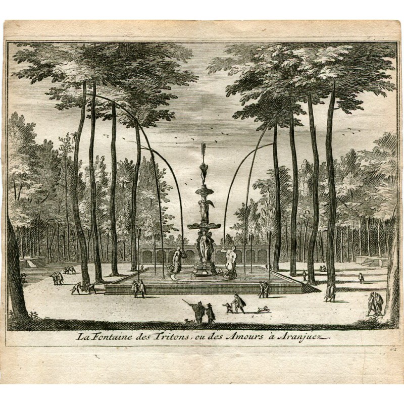 Grabado La fontaine des Tritons ou des Amours á Aranjuez. Procede de la obra de Pieter van der Aa Delices de Espagne et Portugal, publicada en Leyden (Holanda) 1715 (segunda edición) es la obra mas ilustrada sobre España publicada a principios del siglo XVIII. Medidas imagen 12,5x16 cms. Medidas hoja:15,4x15,3 cmsRecipiente :