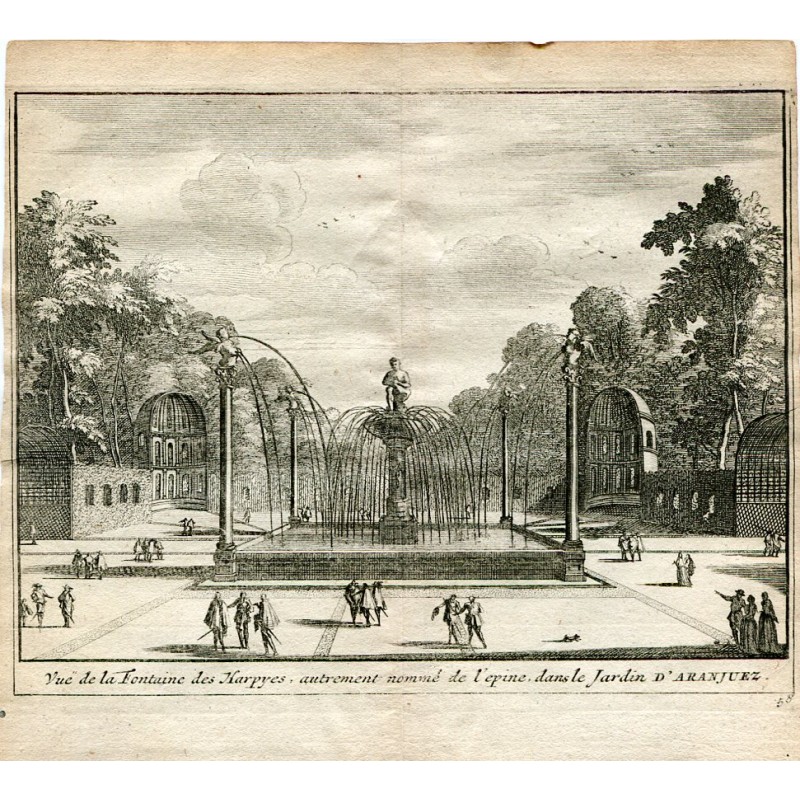 Grabado Vue de la Fontaine des Harpyes autrement nomme de l'epine dans le jardin d'Aranjuez. Procede de la obra de Pieter van der Aa Delices de Espagne et Portugal, publicada en Leyden (Holanda) 1715 es la obra mas ilustrada sobre España publicada a principios del siglo XVIII. Medidas imagen 12,5x16 cms. Medidas hoja:15,5x16 cmsRecipiente :