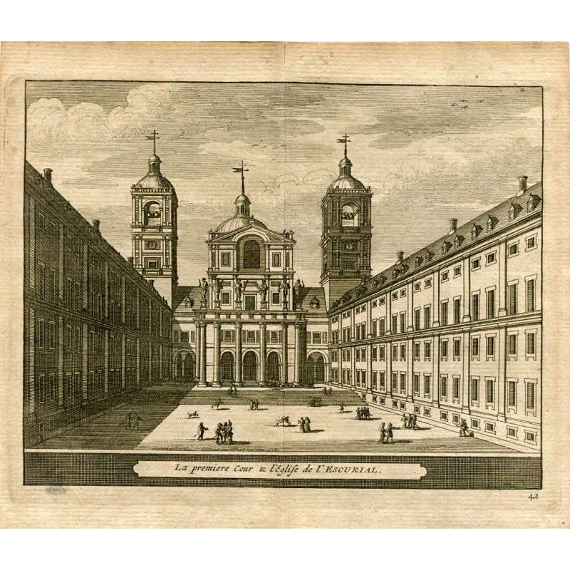Grabado La premiere Cour& l'Eglise de l'Ecorial. Procede de la obra de Pieter van der Aa Delices de Espagne et Portugal, publicada en Leyden (Holanda) 1715 (segunda edición) es la obra mas ilustrada sobre España publicada a principios del siglo XVIII. Medidas imagen 13x15,5 cms. Medidas hoja:15,5x17,5 cmsRecipiente :