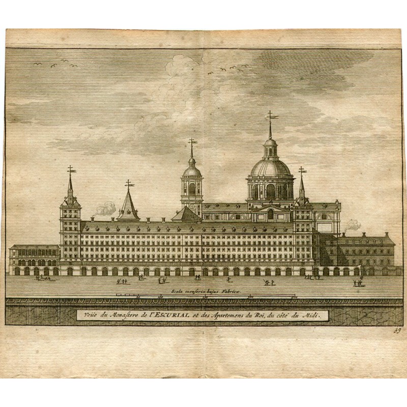 Veue du Monastere de l'Escorial et des Apartemens du Roi du còte du Midi . Procede de la obra de Pieter van der Aa Delices de Espagne et Portugal, publicada en Leyden (Holanda) 1715 es la obra mas ilustrada sobre España publicada a principios del siglo XVIII. Medidas imagen 12,3x17,4 cms. Medidas hoja:15,5x17,9 cmsRecipiente :