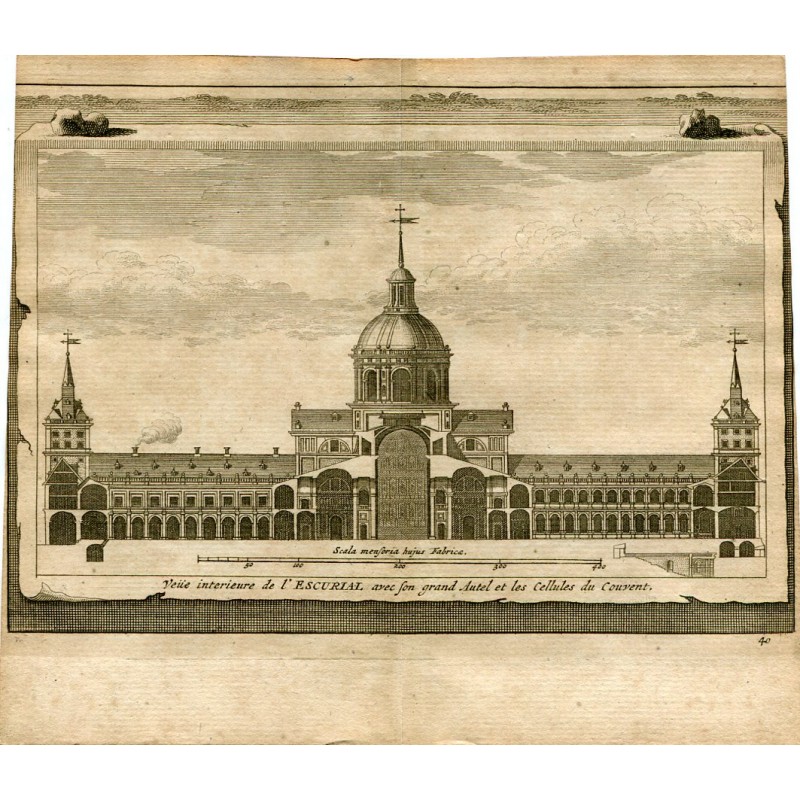 Veue interieure de l'Escorial avec son grand Autel et les Cellules du Couvent. Procede de la obra de Pieter van der Aa Delices de Espagne et Portugal, publicada en Leyden (Holanda) 1715 es la obra mas ilustrada sobre España publicada a principios del siglo XVIII. Medidas imagen 12,3x17,4 cms. Medidas hoja:15,5x17,9 cmsRecipiente :