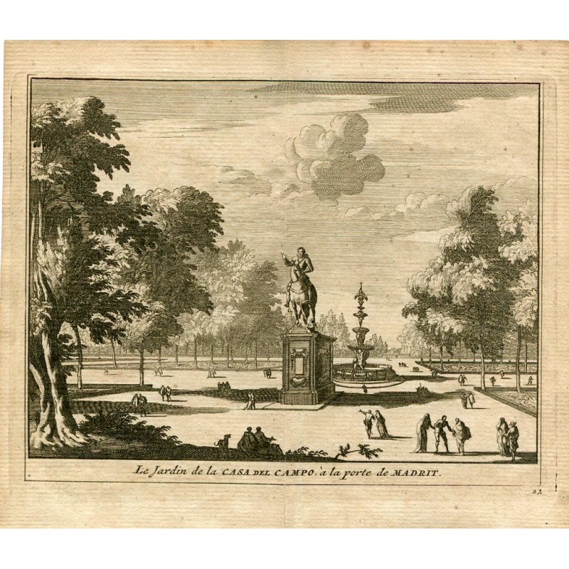 Le jardin de la Casa de Campo a la porte de Madrid. Procede de la obra de Pieter van der Aa Delices de Espagne et Portugal, publicada en Leyden (Holanda) 1715 es la obra mas ilustrada sobre España publicada a principios del siglo XVIII. Medidas imagen 12,4x15,3 cms. Medidas hoja:16,4x17,8 cmsRecipiente :