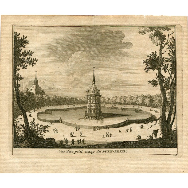 Vue d'un petit etang du Buen Retiro. Procede de la obra de Pieter van der Aa Delices de Espagne et Portugal, publicada en Leyden (Holanda) 1715 es la obra mas ilustrada sobre España publicada a principios del siglo XVIII. Medidas imagen 12,2x15,2 cms. Medidas hoja:15,8x17,8 cmsRecipiente :
