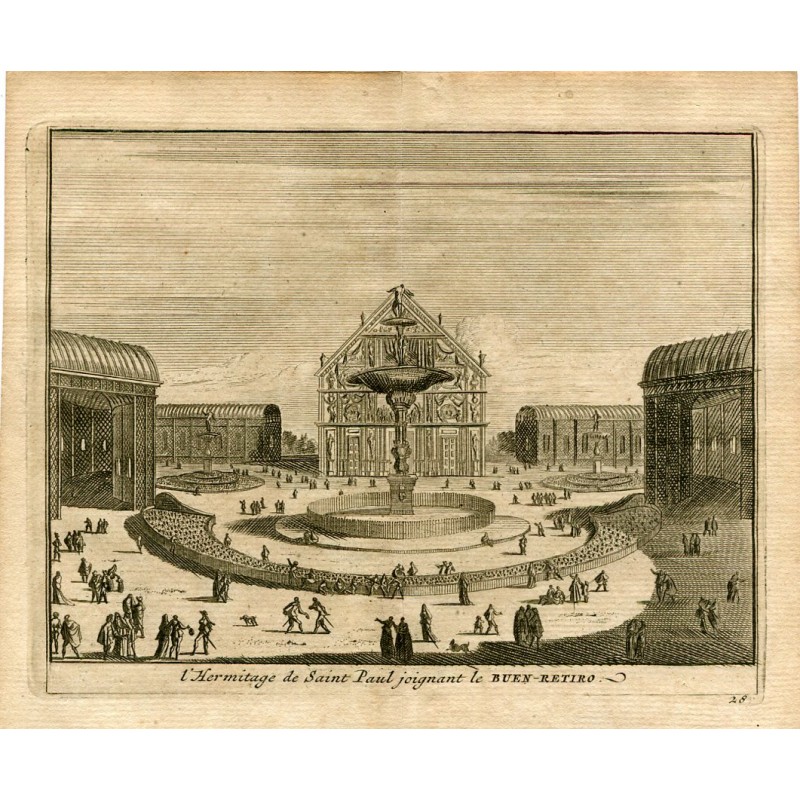L'Hermitage de Saint Paul joignant le Buen Retiro. Procede de la obra de Pieter van der Aa Delices de Espagne et Portugal, publicada en Leyden (Holanda) 1715 es la obra mas ilustrada sobre España publicada a principios del siglo XVIII. Medidas imagen 12,4x15,5 cms. Medidas hoja:15,5x17,4 cmsRecipiente :