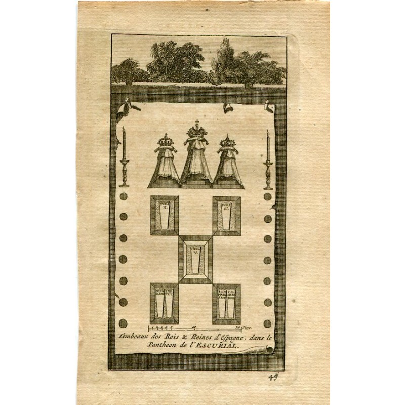 Tombeaux des Rois&Reines de l'Espagne dans le Pantheon de l'Escorial. Procede de la obra de Pieter van der Aa Delices de Espagne et Portugal, publicada en Leyden (Holanda) 1715 es la obra mas ilustrada sobre España publicada a principios del siglo XVIII. Medidas imagen 12,5x6,5 cms. Medidas hoja:15,5x9,5 cmsRecipiente :
