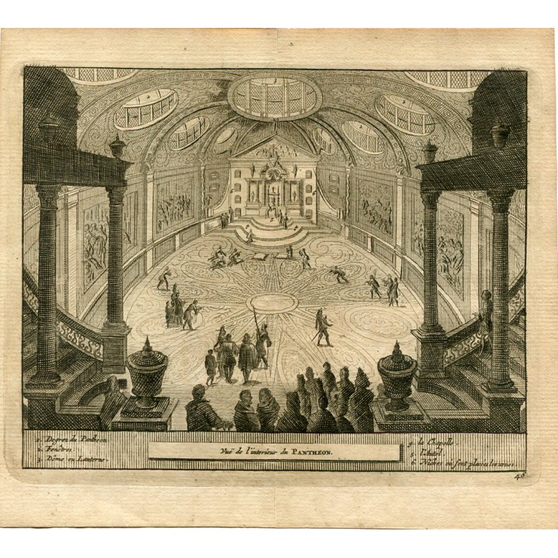 Vue de l'interieur du Pantheon. Procede de la obra de Pieter van der Aa Delices de Espagne et Portugal, publicada en Leyden (Holanda) 1715 es la obra mas ilustrada sobre España publicada a principios del siglo XVIII. Medidas imagen 12,4x15,2 cms. Medidas hoja:15,5x17,3 cmsRecipiente :