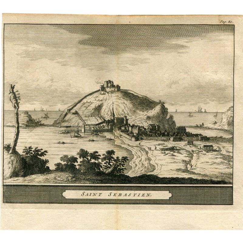 Vista de Saint Sebastien. Procede de la obra de Pieter van der Aa Delices de Espagne et Portugal, publicada en Leyden (Holanda) 1707 es la obra mas ilustrada sobre España publicada a principios del siglo XVIII. Medidas imagen 12,5x15,6 cms. Medidas hoja:15,4x17 cmsRecipiente :