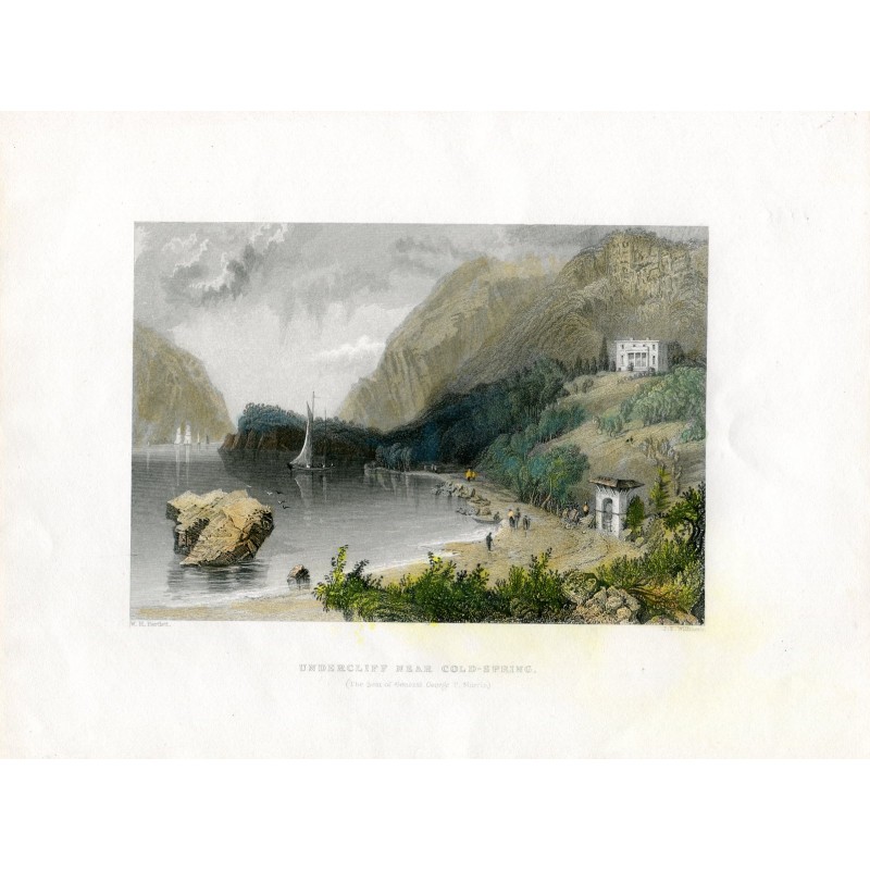 Grabado pintado a mano con leyenda impresa debajo de la imagen 'Undercliff cerca de Cold-spring (la sede del General George P. Morris). Artista: a partir de obra de William Henry Bartlett (1809 - 1854). Grabador: James Tibbitts Willmore (1800-1863). Tamaño de la imagen: 12,3x17,8 cm. Tamaño del papel: 20,6x27 cm. En buena condición.Recipiente :