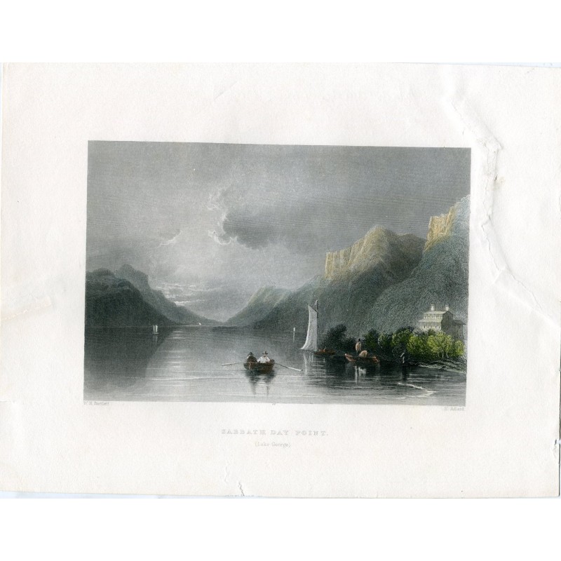 Título: Punto de día sabático, lago George. Artista: a partir de obra de W H Bartlett (1809 - 1854). Grabador: Henry Adlard (británico, 17991893). Descripción: grabado coloreado a mano sobre papel avitelado. Fecha: 1840. Tamaño de la imagen: 12,2x26,6 cms. Tamaño de la hoja: 20,6x26,6 cm. Estado: tiene algunas restauraciones con cintas como se puede ver en las imágenes que no afectan la imagen.Recipiente :