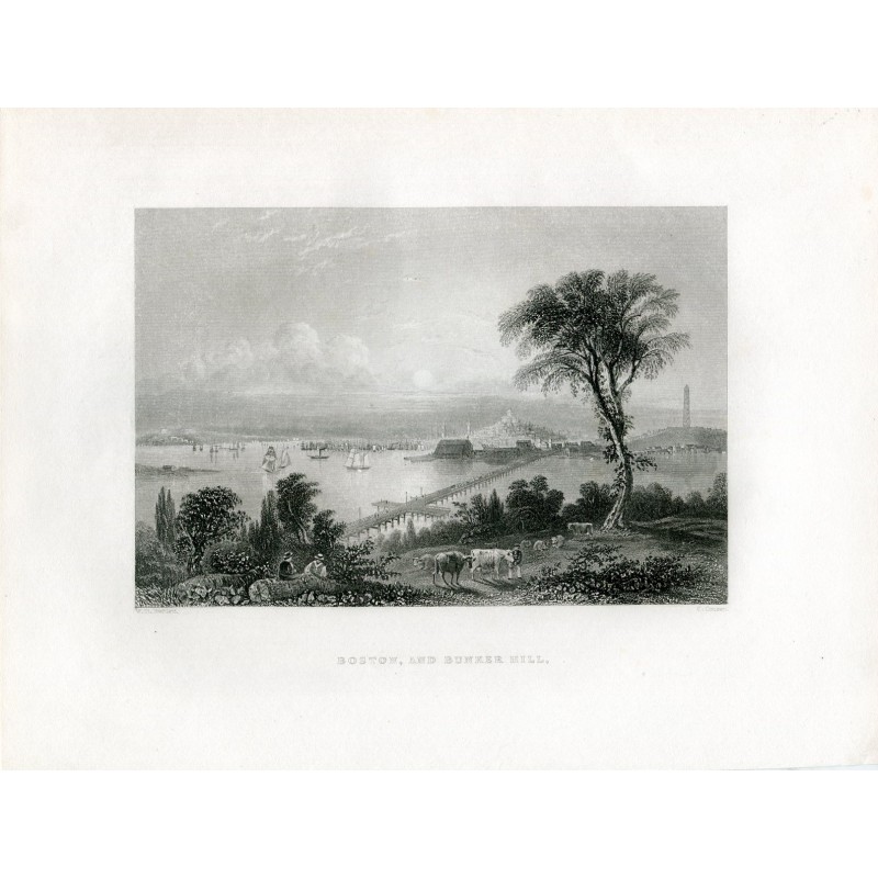 Título: Boston y Bunker Hill. Artista: a partir de obra de William Henry Bartlett (1809 - 1854). Grabador: Charles Cousen (1819-1889). Descripción: acero antiguo grabado sobre papel avitelado. Fecha: 1840. Tamaño de la imagen: 12,1x18 cm. Tamaño de la hoja: 20,6x27,1 cm. Estado: bien.Recipiente :